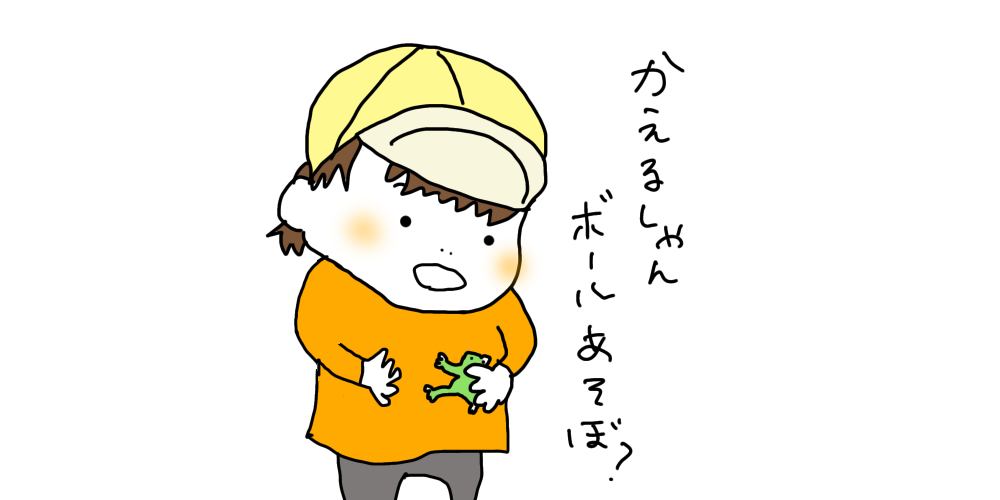 「息子君はかえるさんと遊びたかったようで、“一緒にやろうね~”とボールを持たせようとする姿が可愛らしかったです。時折、かえるに負担がかかるようなことがありました。引き続き、かえるが大好きな思いを受け止めながらも、かえるの思いを考えながら遊ぶことができるよう、見守っていきたいと思います。」